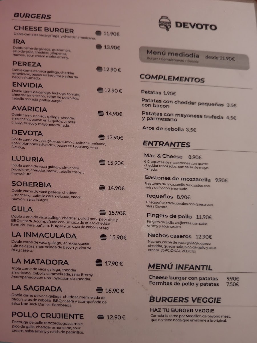 Devoto Burger - Ensanche, located at Av. Arteixo 9 in A Coruña, offers a compelling menu that elevates the hamburger experience. Their hallmark is the doppio Galician beef patties, packed with rich flavors and cooked to perfection. Signature burgers like La Devota Burger, featuring cheddar, sautéed mushrooms, bacon, and a unique Devota sauce, showcase a balance of smoky and savory notes. For those who prefer a spicy kick, La Ira Burger combines jalapeños, nachos, and sour cream, crafting an exciting texture and taste fusion.